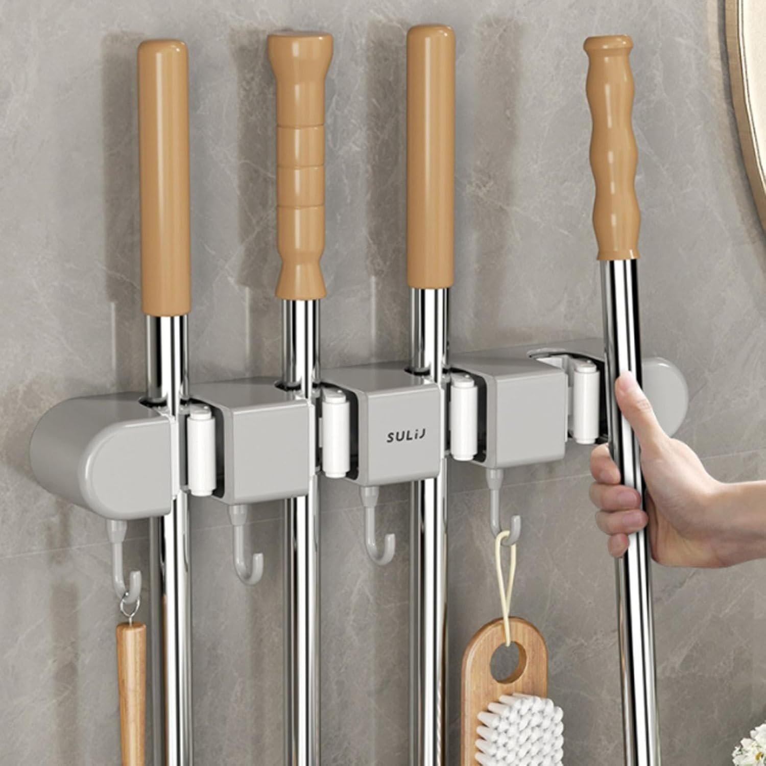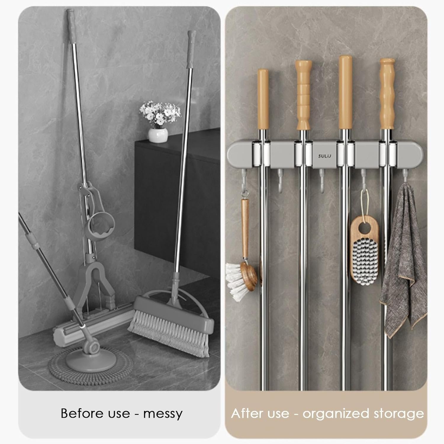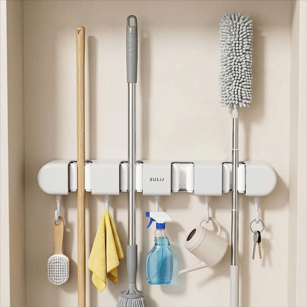 - سعة تخزين 9 في 1: مزود بـ 4 مقابض آلية للمكنسات و 5 خطافات عملية قابلة للطي لتعليق الفوط، المفاتيح، أو أدوات المطبخ الصغيرة.