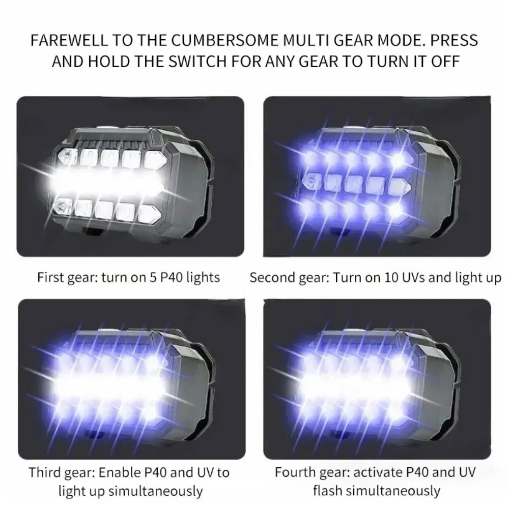 - إضاءة مزدوجة ذكية: يجمع بين الإضاءة البيضاء القوية للرؤية الليلية الواضحة، والإضاءة فوق البنفسجية (UV) المخصصة لكشف العقارب أو فحص السوائل والأشياء غير المرئية.
