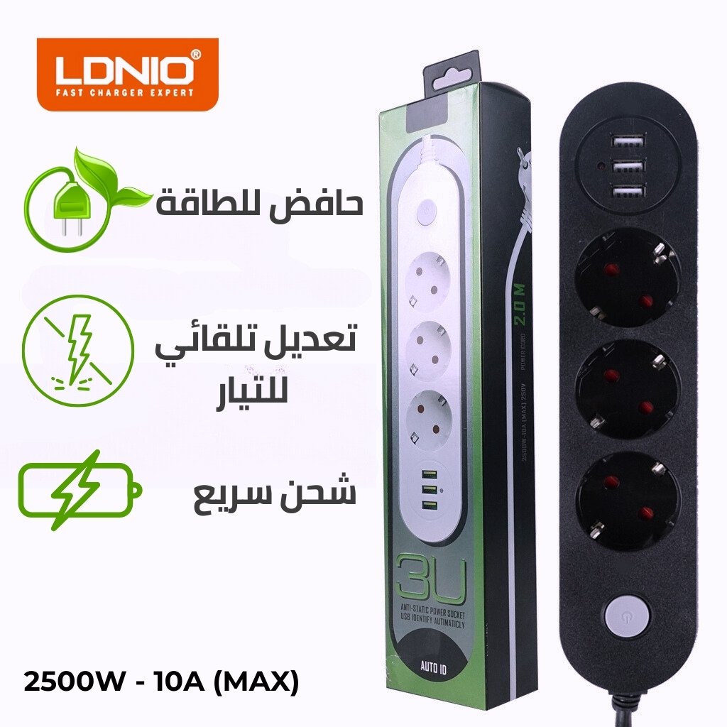 مشترك كهربائي مع 3 منافذ USB للشحن السريععدد المنافذ: 3 منافذ USB عالية السرعة لشحن الهواتف والأجهزة الإلكترونية.القدرة: 2500 واط – 10 أمبير (بحد أقصى) – 250 فولت.الكابل: بطول 2 متر.الأبعاد: ‎290 × 52 × 41 ملم.تيار الخرج لكل منفذ USB: 17 واط.المميزات:شحن آمن مع حماية من التيار الزائد.توزيع تلقائي للتيار بما يتناسب مع الجهاز.مقاوم لدرجات الحرارة العالية.شحن متزامن لثلاثة أجهزة ذكية بسرعة عالية.