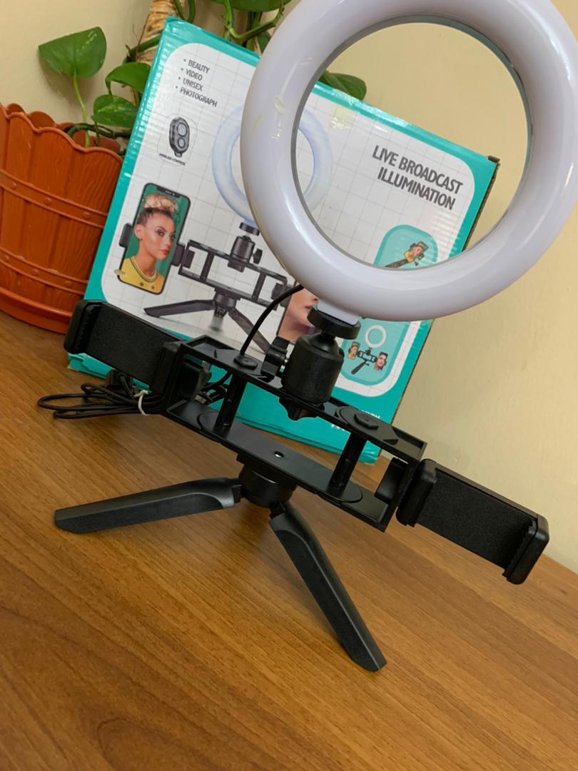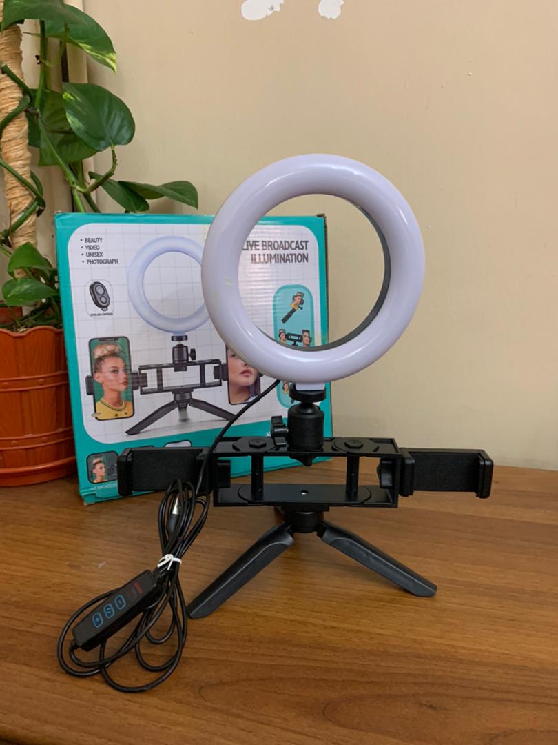 حلقة إضاءة للبث المباشر والتصويرإضاءة احترافية: ثلاثة أوضاع إضاءة (دافئة، ناعمة، باردة) مع 10 مستويات سطوع لكل وضع.هيكل مرن: دوران حتى 180° مع حامل هاتف مزدوج وقاعدة ثابتة، وكابل USB بطول 180 سم.تحكم سهل: ريموت للتحكم في تشغيل الضوء والتقاط الصور والفيديو عن بُعد.نتائج محسّنة: توحّد إضاءة البشرة وتبرز ملامح الوجه بوضوح، كما تمنح العيون مظهراً لامعاً وجذاباً.الأبعاد: حجم الحامل 40×29 سم.