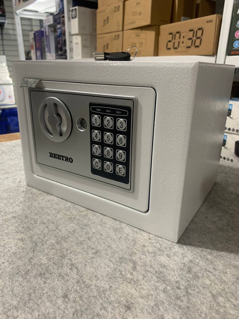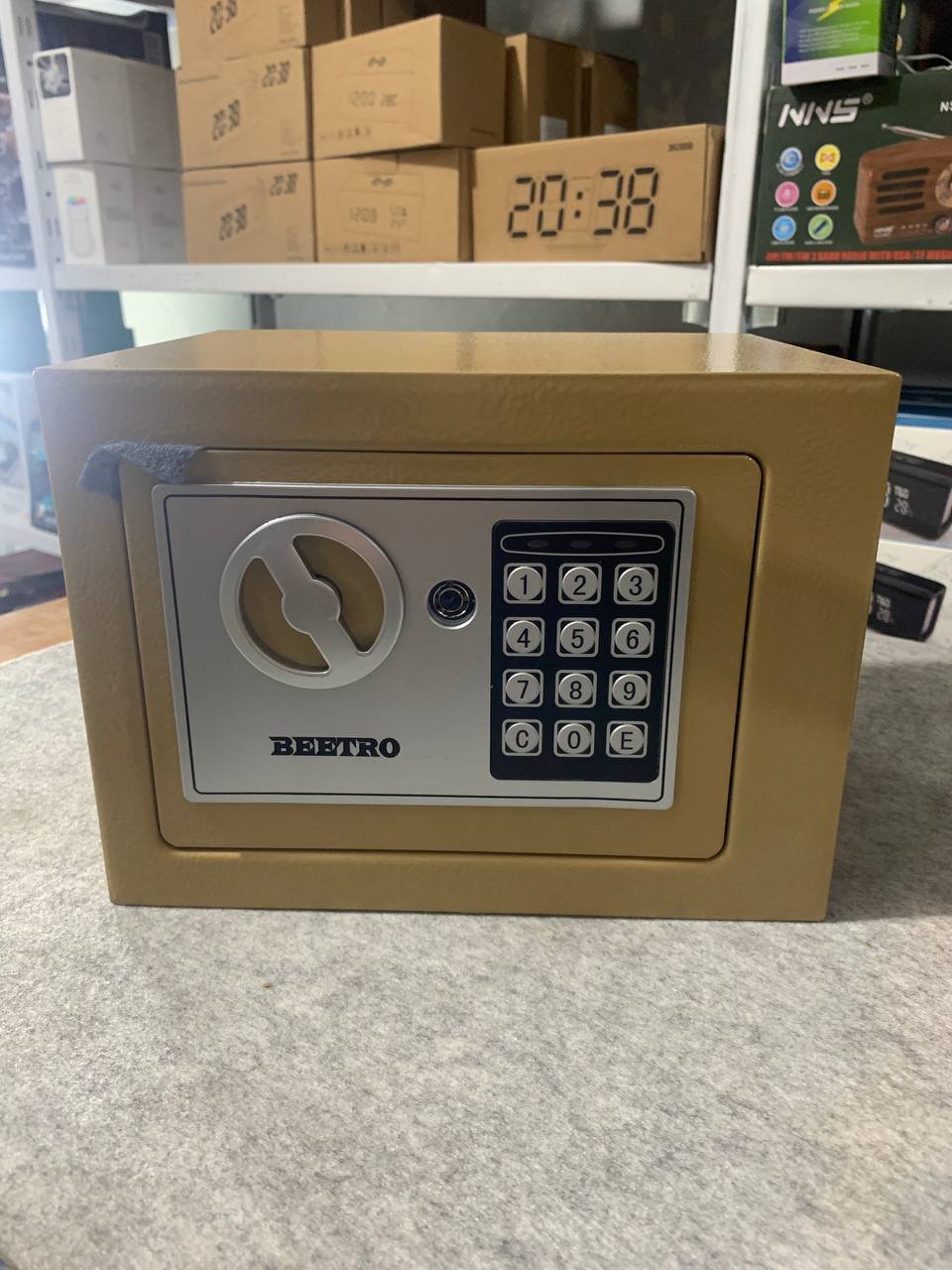 خزنة آمنة بترميز رقمي ومفاتيح احتياطيةقفل رقمي قابل للبرمجة (3 إلى 8 أرقام).إمكانية الفتح الطارئ باستخدام مفتاحين مرفقين.دعم التركيب على الجدار أو داخل الخزانة.قفل عالي الجودة بمزلاجين فولاذيين (إغلاق مزدوج).الوزن: 2.4 كجم.الأبعاد: 25×19×19 سم.