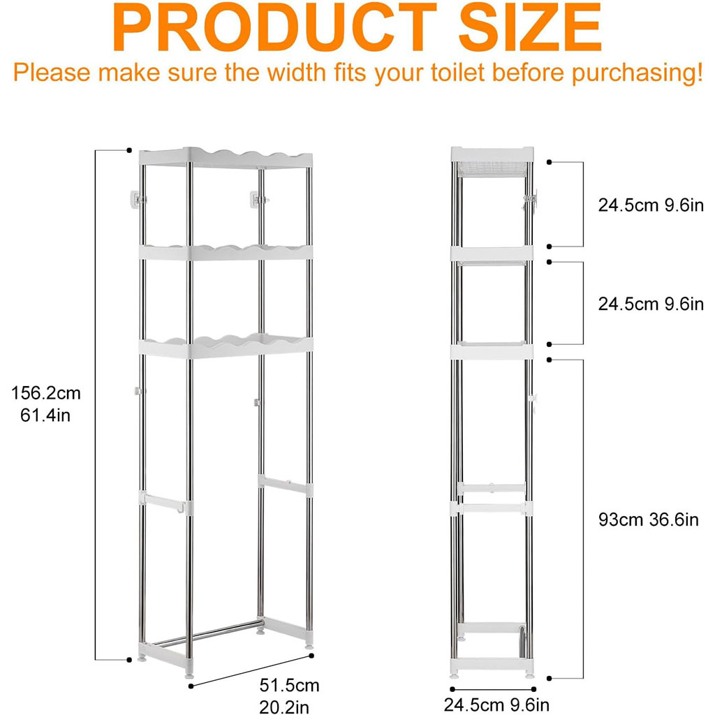 رف حمام متعدد الاستخداماتتوسيع المساحة: أبعاد 50.5 × 24.5 × 169.5 سم لتوفير المساحة فوق المرحاض.تخزين متعدد: يحتوي على 3 رفوف مفتوحة و2 خطافات لتعليق الأدوات اليومية.بنية قوية: مصنوع من الفولاذ الكربوني المطلي المقاوم للصدأ والصدمة.استخدام متعدد: يمكن وضعه فوق المرحاض أو الغسالة أو في المطبخ والشرفة والصالة.تجميع سهل: تركيب بسيط وخفيف الوزن دون الحاجة لأدوات معقدة.