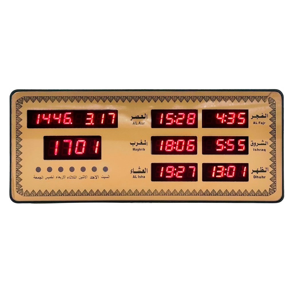ساعة رقمية إلكترونية لعرض مواقيت الصلاةيتم استخدامها عادة في المساجد أو المنازلتعرض أوقات الصلوات الخمس:الفجرالظهرالعصرالمغربالعشاءتعرض أيضًا توقيت الشروقتصميم فاخر بإطار ذهبيشاشة رقمية LED لعرض المواقيتالمميزات:عرض دقيق لمواقيت الصلاةوضوح عالي بفضل شاشة LEDتصميم أنيق يناسب ديكور المساجد والمنازلسهولة التثبيت والاستخدام