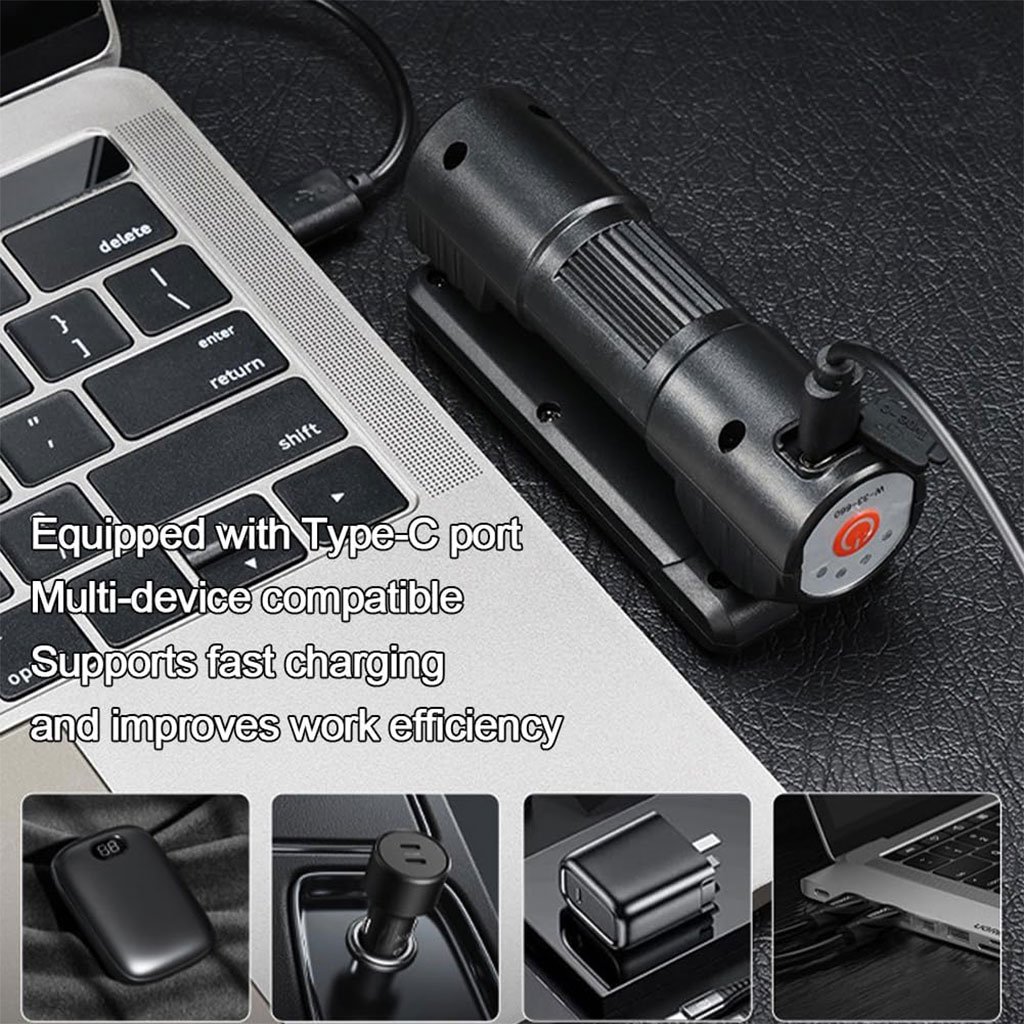 مصباح LED محمول بقبضة مغناطيسية 🔦شحن سريع بمنفذ USB-C:استعد للعمل بسرعة بفضل منفذ الشحن السريع الذي يقلل فترات التوقف.مصدران للإضاءة:مزود بضوء كشاف مركز وإضاءة عاكسة لتغطية جميع احتياجات العمل.متين لمختلف الظروف الجوية:تصميم مقاوم للمطر والعوامل الخارجية للاستخدام في الهواء الطلق دون قلق.مرونة عالية في الإضاءة:قابل للدوران بزوايا متعددة مع قاعدة مغناطيسية قوية لتثبيته على أي سطح معدني بسهولة