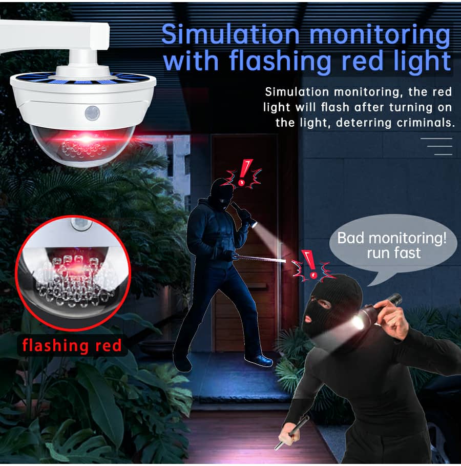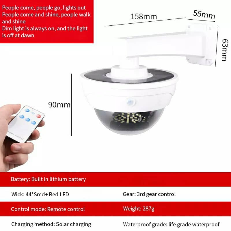 خصائص المنتج:حل أمني بتكلفة منخفضة: مصنوع من مادة ABS عالية الجودة ويشبه كاميرا حقيقية، مزود بحساس استشعار بالأشعة تحت الحمراء، يعمل كإضاءة عند العودة للمنزل ليلاً مع تأثير ردع للصوص والتخريب دون تكلفة الكاميرات الحقيقية.الطاقة الشمسية: مزود بلوح شمسي يشحن البطاريات القابلة لإعادة الشحن (البطاريات مرفقة) نهارًا، ويتوقف عن العمل لتوفير الطاقة، ويعمل تلقائيًا عند حلول الظلام باستخدام الطاقة المخزنة.سهولة التركيب: لا حاجة للأسلاك أو المقابس، مع حامل تثبيت قابل للتعديل ومسامير للتثبيت على الجدار أو السقف بسهولة.3 أوضاع تشغيل: إضاءة قوية/إطفاء – إضاءة قوية/إضاءة ضعيفة – إضاءة مستمرة، يمكن التبديل بينها عبر جهاز التحكم عن بعد.المواصفات:اللوح الشمسي: 5.5 فولتالبطارية: 3.7 فولت 18650 بسعة 2400 مللي أمبيرنوع المصابيح: SR-2118A (44 لمبة SMD + لمبة حمراء)، SR-2118B (19 لمبة SMD + لمبة حمراء)مقاومة الماء: IP65المادة: ABS عالي الجودة