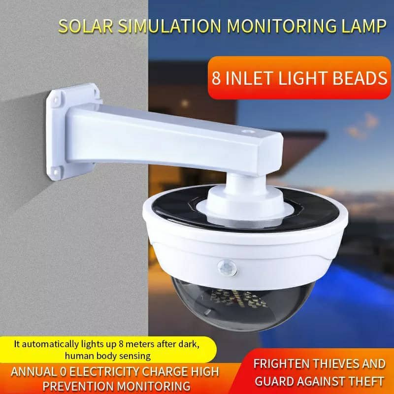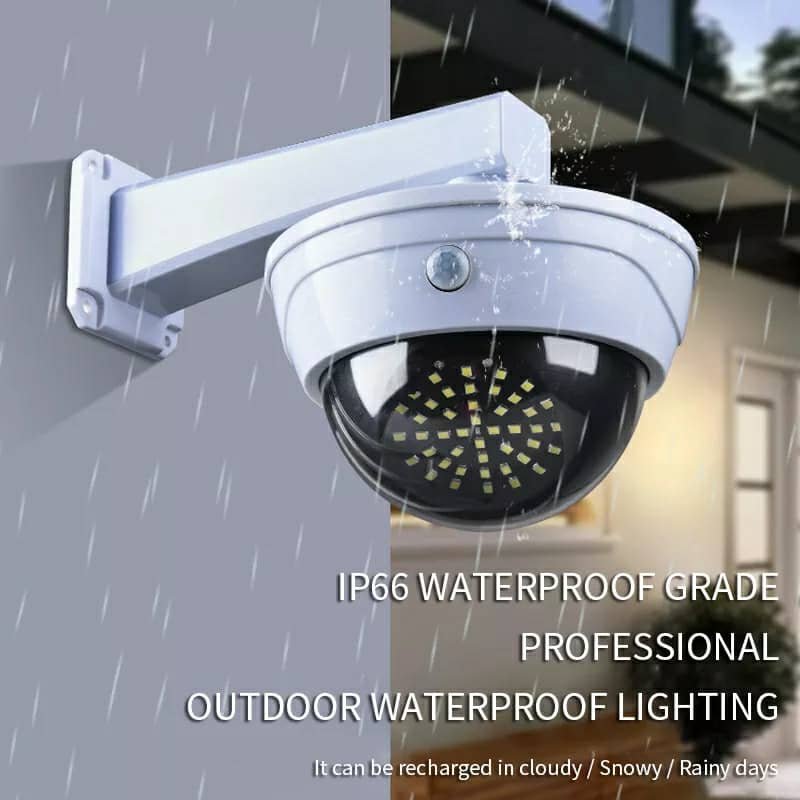 خصائص المنتج:حل أمني بتكلفة منخفضة: مصنوع من مادة ABS عالية الجودة ويشبه كاميرا حقيقية، مزود بحساس استشعار بالأشعة تحت الحمراء، يعمل كإضاءة عند العودة للمنزل ليلاً مع تأثير ردع للصوص والتخريب دون تكلفة الكاميرات الحقيقية.الطاقة الشمسية: مزود بلوح شمسي يشحن البطاريات القابلة لإعادة الشحن (البطاريات مرفقة) نهارًا، ويتوقف عن العمل لتوفير الطاقة، ويعمل تلقائيًا عند حلول الظلام باستخدام الطاقة المخزنة.سهولة التركيب: لا حاجة للأسلاك أو المقابس، مع حامل تثبيت قابل للتعديل ومسامير للتثبيت على الجدار أو السقف بسهولة.3 أوضاع تشغيل: إضاءة قوية/إطفاء – إضاءة قوية/إضاءة ضعيفة – إضاءة مستمرة، يمكن التبديل بينها عبر جهاز التحكم عن بعد.المواصفات:اللوح الشمسي: 5.5 فولتالبطارية: 3.7 فولت 18650 بسعة 2400 مللي أمبيرنوع المصابيح: SR-2118A (44 لمبة SMD + لمبة حمراء)، SR-2118B (19 لمبة SMD + لمبة حمراء)مقاومة الماء: IP65المادة: ABS عالي الجودة