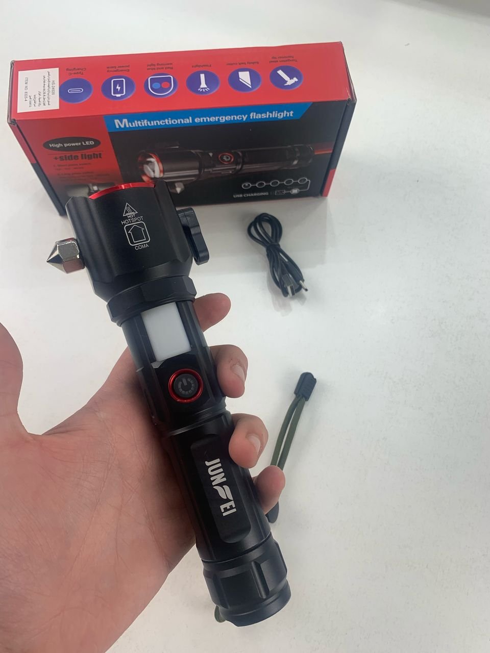 🔦 كشاف يدوي قوي متعدد الوظائف ✅ إضاءة لمسافة تتجاوز 500 متر لتغطية واسعة وزيادة الرؤية ليلاً ✅ يعمل ببطارية قابلة للشحن عبر منفذ USB Type-C ✅ مزوّد بمطرقة أمان وقاطع للطوارئ، مثالي لحالات الحوادث ✅ هيكل من سبائك الألمنيوم المقاوم للصدمات والوقوع حتى 1 متر ✅ أوضاع إضاءة متعددة: قوي / متوسط / منخفض + إضاءة جانبية COB مثالي للرحلات، التخييم، وحالات الطوارئ