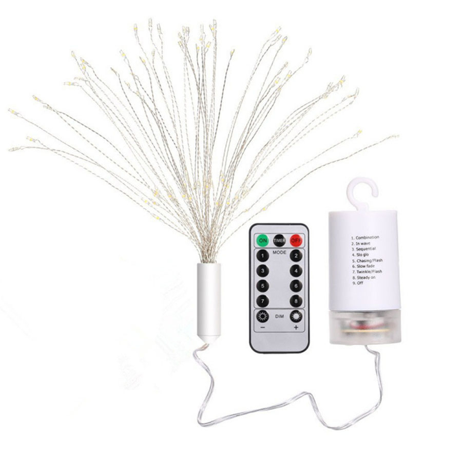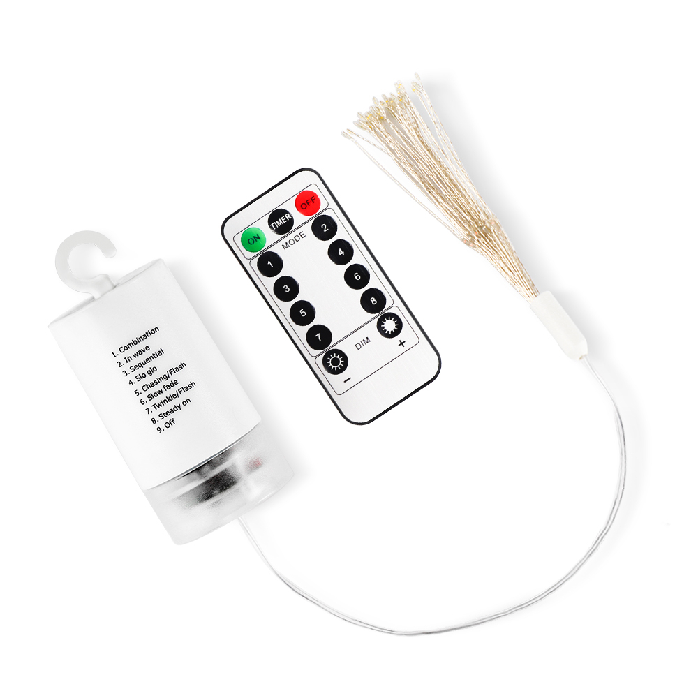 المواصفات:يعمل بأربع بطاريات AA (مقاوم للماء IP44)القدرة: 3 واطشدة الإضاءة: أقل من 10 lm لكل LEDعمر التشغيل: 20000 ساعةوظيفة المؤقت: 8 ساعات تشغيل / 16 ساعة إيقافمناسب للاستخدام الداخلي والخارجيدرجة الحرارة: من -20° إلى +35°لون الإضاءة: أبيض دافئ (3000K)أبعاد: 40 سلك × 25 سم مع 3 لمبات LED لكل سلك (الإجمالي 120 LED)العبوة تحتوي على:مصباح ألعاب نارية LED / لمبة متفجرة MCE419جهاز تحكم عن بُعددليل الاستخدام