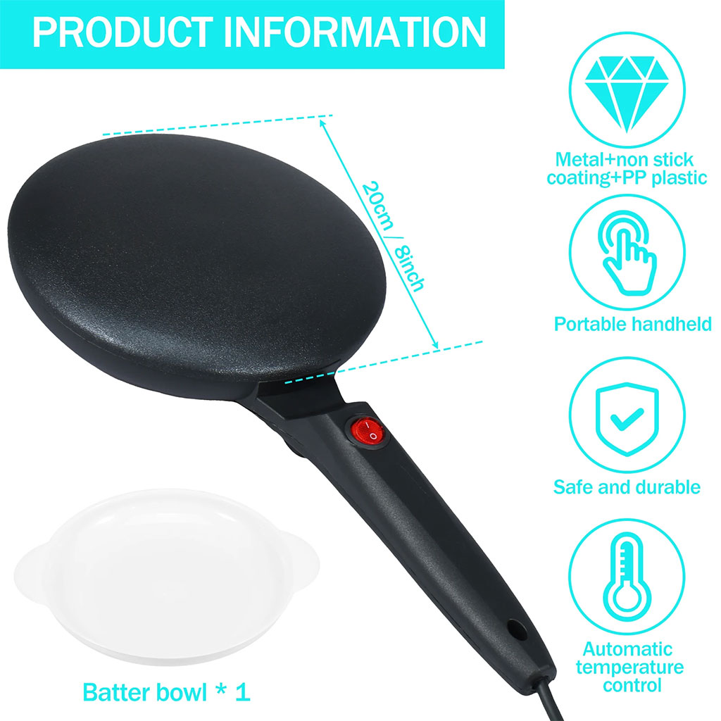 سهل الاستعمال: آلة صنع الكريب الكهربائية دائرية من جهة واحدة، بسطح غير لاصق وسهلة الاستخدام. يكفي مسح لوح الطهي بقطعة قماش مبللة. تأكّد من أن الجهاز جاف تمامًا قبل تخزينه.متعددة الاستعمالات: اللوح المغطّى بطبقة غير لاصقة يتيح لك تحضير الكريب، التورتيلا الطرية، التاكو، البان كيك، لفائف البيض وغيرها من أطباق الفطور المفضّلة بسرعة وسهولة في حوالي 20 ثانية. مقبض طويل مريح للحمل والاستعمال، يوفّر المساحة ويمنحك إحساسًا بالأمان.الطهي: صانعة الكريب الكهربائية لدينا مزوّدة بسطح يساعد على تحضير الطعام بسهولة. هذه المقلاة مصمّمة للطهي السريع، ومناسبة لأي طاولة أو سطح مطبخ. ابدأ بتحضير البيض والكريب من أجل نمط حياة أكثر صحّة.التحكّم الأوتوماتيكي في درجة الحرارة: تأتي صانعة الكريب بمنظّم حرارة أوتوماتيكي لتجنّب الاحتراق. وحدة تسخين عالية القدرة مع زر تشغيل/إيقاف تُشير إلى الوقت المناسب لبدء الطهي عند الوصول إلى الحرارة المثالية.سهلة الاستخدام: آلة كريب كهربائية مدمجة مع سطح طهي كبير بقطر 20.3 سم لتسهيل التحضير. قم بالتسخين المسبق أولًا، ثم افرد طبقة رقيقة من العجين وشاهد الكريب ينضج خلال ثوانٍ قليلة.