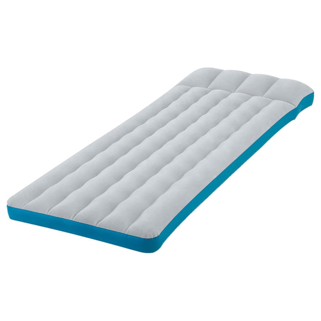 مرتبة هوائية للتخييم من Intexالخامة: 87٪ PVC، 10٪ بوليستر (PET)، 3٪ رايونالأبعاد: تقريبًا 72 × 189 × 20 سم (العرض × الطول × الارتفاع)تصميم مميز بطبقتين مقومتين، السطح أبيض والقاعدة زرقاءسطح مخملي مموج بتصميم 6 خطوط رأسية مع حواف مستديرة