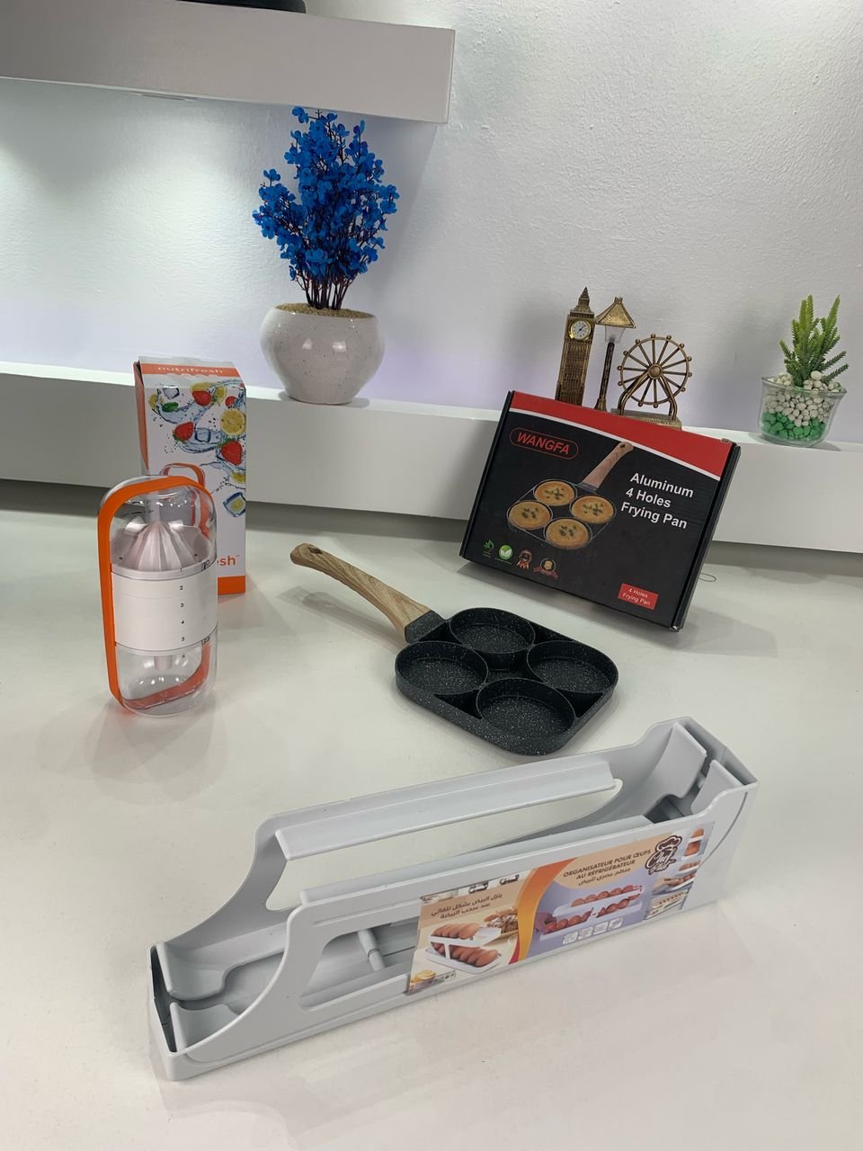⦿ باك أدوات المطبخ المتكامل (حامل بيض + مقلاة + أكواب قياس 6 في 1)حامل بيض (12-14 بيضة):مصنوع من البولي بروبيلين المتين.تصميم ذكي مع ميلان تلقائي للوصول السريع للبيض.تنظيم مثالي وتوفير مساحة في الثلاجة.مقلاة مضادة للالتصاق للبيض والفطائر:طلاء عالي الجودة لتوزيع حراري متساوٍ.مثالية للفطائر، البيض، البان كيك وغيرها.متوافقة مع معظم أنواع المواقد.مجموعة أكواب قياس 6 في 1:مثالية للقياس، الخلط، والصب بسهولة.تصميم متداخل لتوفير المساحة.متعددة الاستخدام في المطبخ اليومي.لماذا تختار هذا الباك؟ ✔ اختصار للوقت بفضل أدوات عملية. ✔ جودة ومتانة عالية. ✔ تعدد الاستخدام في الطهي والتخزين.