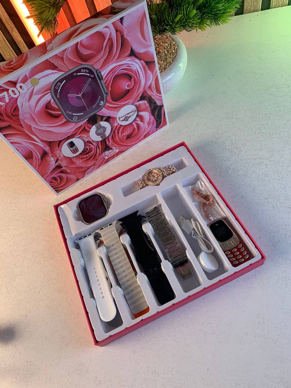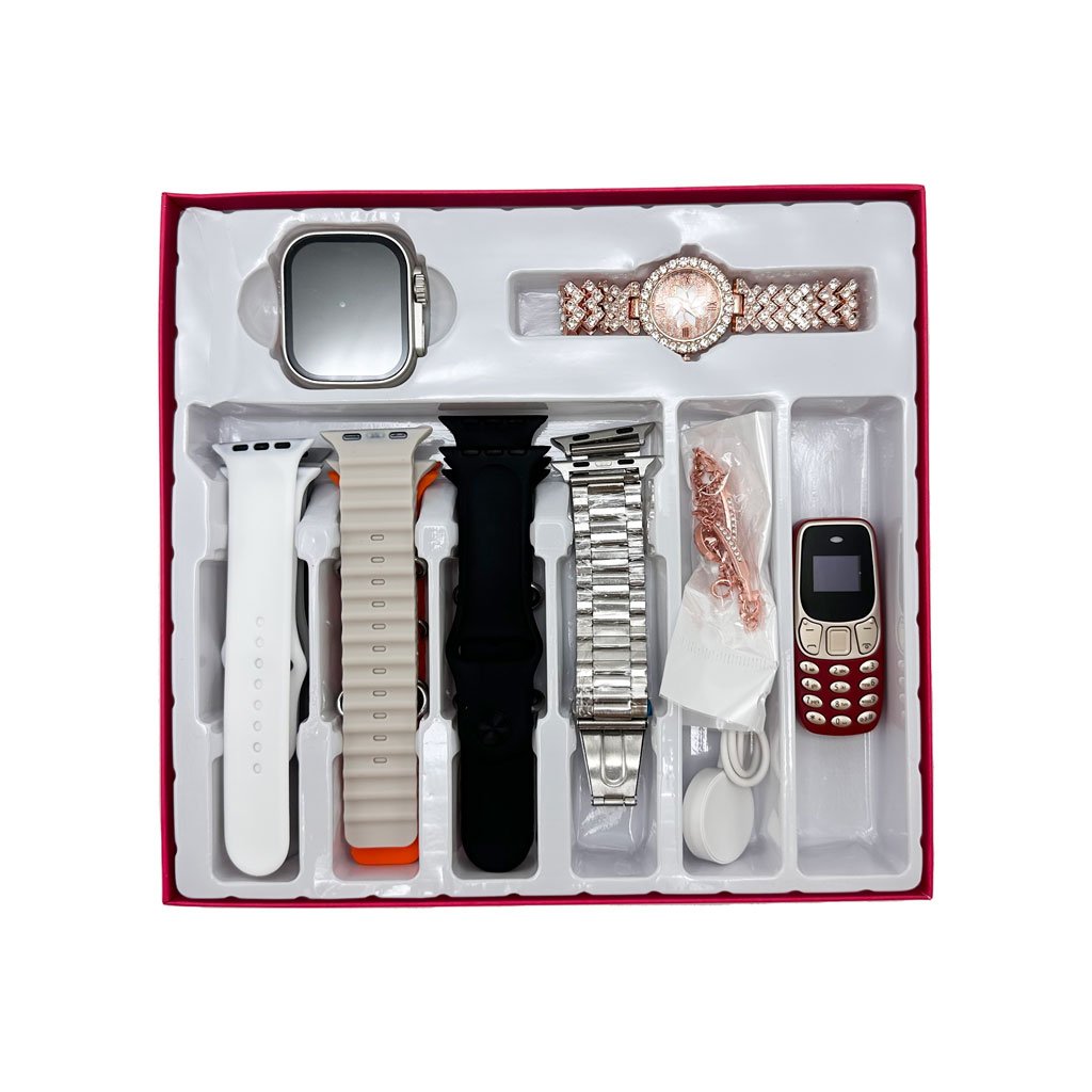 Pack Smartwatch Ultra X2 avec 7 Bracelets Montre pour Femmes – طقم ساعة ذكية وساعة نسائية مع هاتف حجم صغير