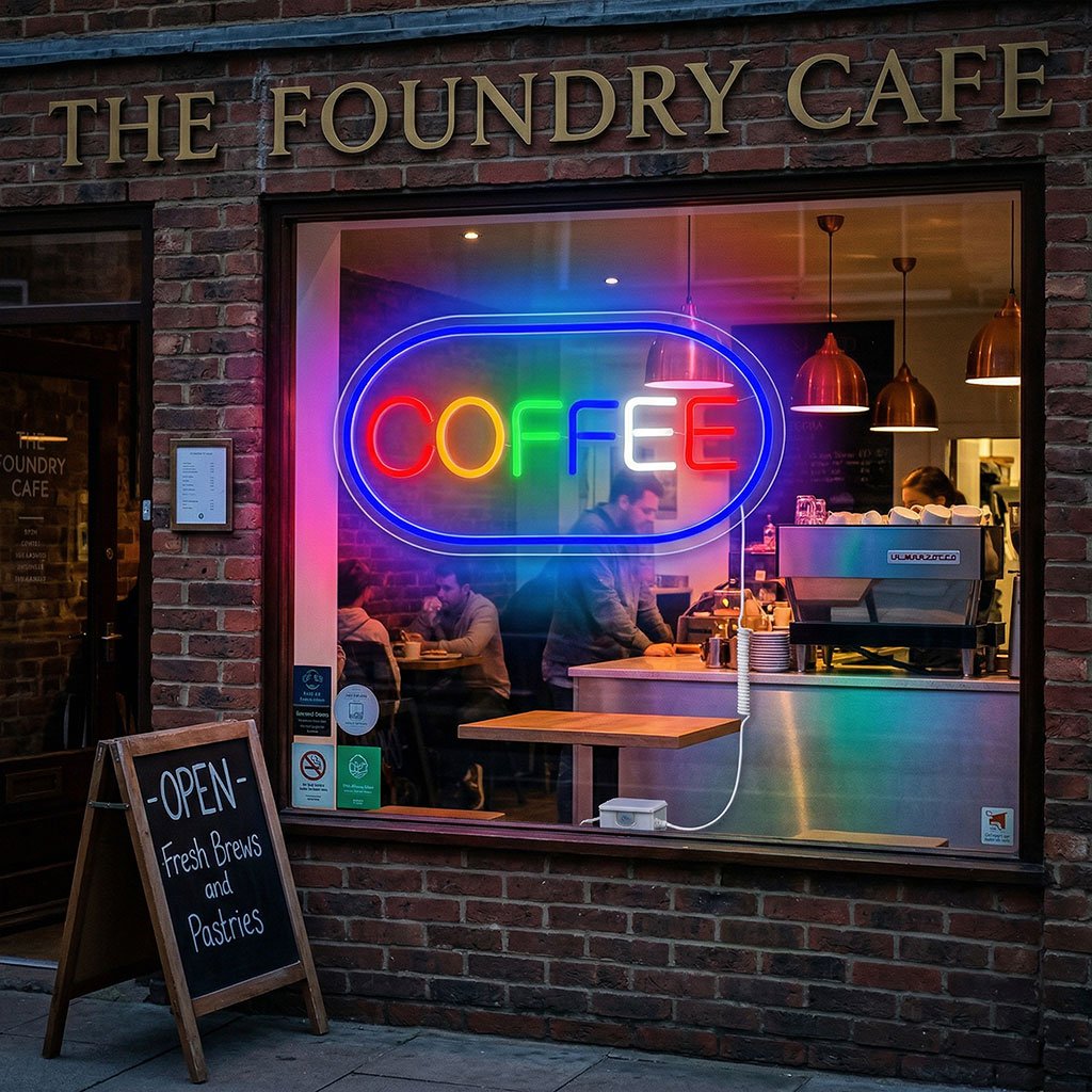- تكنولوجيا LED الباردة: على عكس النيون الزجاجي القديم، هذه اللوحة لا تسخن أبداً، وهي آمنة للمس ومقاومة للكسر، مما يجعلها مثالية للأماكن المزدحمة.