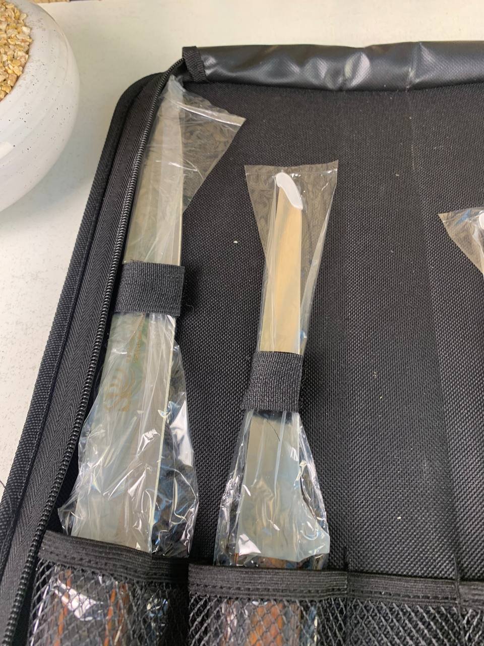 - حقيبة التنظيم المحمولة: حقيبة متينة مخصصة لكل سكين، تحمي الشفرات من التلف وتضمن لك سلامة النقل والتخزين السهل في المطبخ أو السيارة.