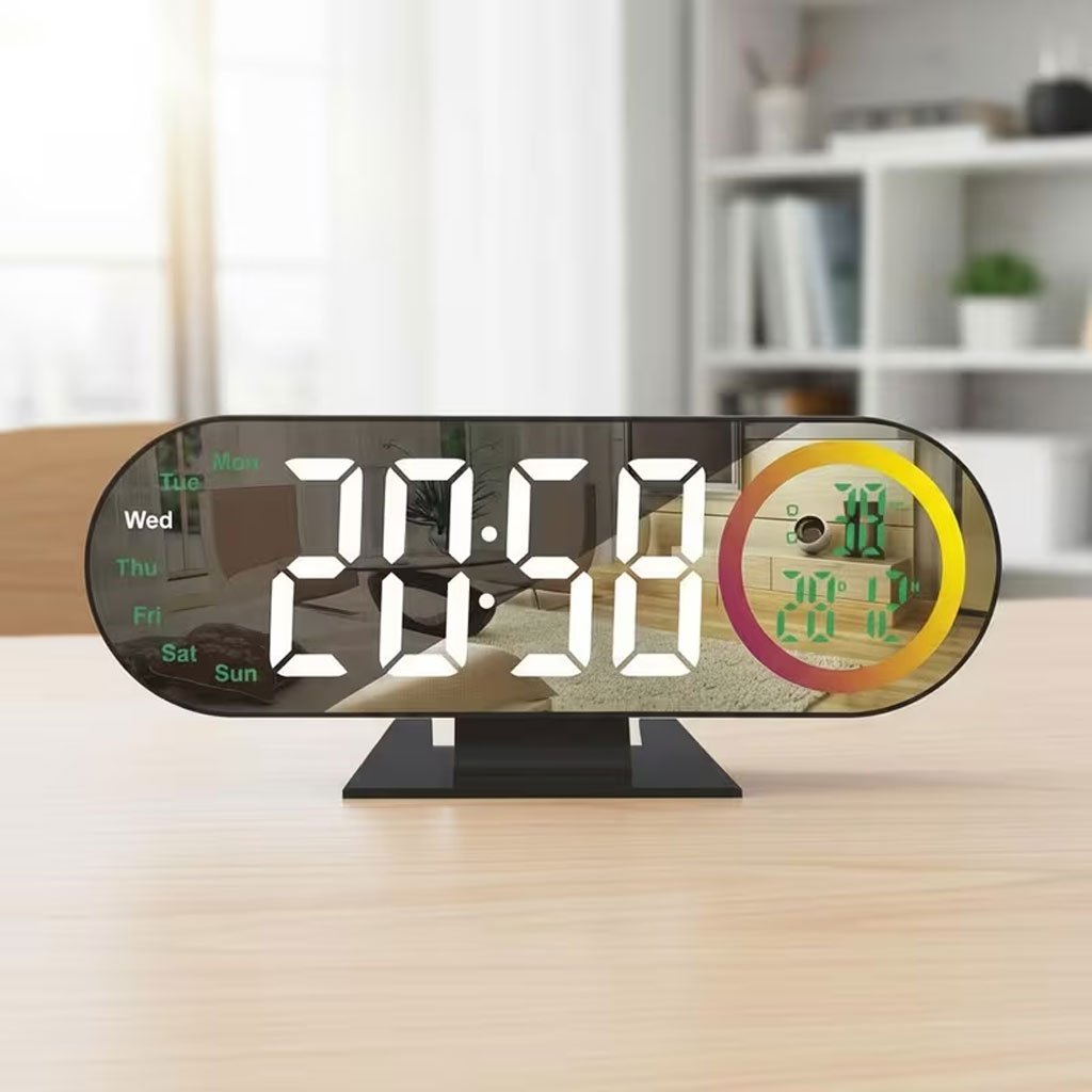 ⏰ منبّه مرآة ذكي متعدد الوظائف اجمع بين الأناقة والتقنية مع هذا المنبّه العصري الذي يمنحك تجربة استخدام مريحة وعملية يوميًا ✨🕒 عرض شامل وواضحعرض الوقت ⏱️عرض التاريخ 📅عرض اليوم 🗓️عرض درجة الحرارة 🌡️💡 4 مستويات لضبط السطوع اضبط سطوع الشاشة بسهولة عبر زر SNZ:🔆 سطوع عالٍ🔅 سطوع متوسط🔸 سطوع منخفض⬛ إيقاف الشاشةمثالي للاستخدام نهارًا أو ليلًا بدون إزعاج 👌⏰ منبّه مزدوج + وظيفة الغفوة (Snooze)إمكانية ضبط منبّهينأوضاع التكرار:📆 من الإثنين إلى الجمعة (1-5)📆 من الإثنين إلى السبت (1-6)📆 يومي (1-7)⏳ مدة الغفوة الافتراضية: 5 دقائق🌙 وضع الليل الذكيتعتيم تلقائي للشاشة من 18:00 مساءً إلى 05:59 صباحًاقابل للتفعيل أو الإيقاف بسهولةإمكانية تعديل فترة وضع الليل حسب رغبتك🌈 إضاءة محيطية RGB ديناميكية أضف لمسة جمالية لغرفتك:🎨 7 ألوان ثابتة🔄 أوضاع انتقال لوني جذابة🌈 عرض دائري بـ 6 ألوان🎆 24 وضع عرض ثنائي اللون🌟 تأثير تدرّج لوني أنيق (تشغيل/إيقاف بسهولة بزر واحد)🔁 التبديل الذكي⏱️ نظام 12 / 24 ساعة🌡️ ℃ / ℉نطاق قياس الحرارة: -10℃ إلى 50℃ | 14℉ إلى 122℉🔌 ذاكرة انقطاع الكهرباءيعمل عبر USB🔋 بطاريتان AAA (غير مرفقتين) فقط لحفظ الإعدادات عند انقطاع الكهرباء📦 مواصفات المنتج🎨 الألوان: برتقالي / أبيض / أخضر / أزرق⚡ الإدخال: 5V – 1A (المحوّل غير مرفق)📏 الحجم: 23 × 9.5 × 5.5 سم🔌 طول كابل USB: 100 سم📦 محتويات العلبة ✔️ منبّه مرآة ذكي ✔️ دليل الاستعمال ✔️ كابل USB (100 سم)
