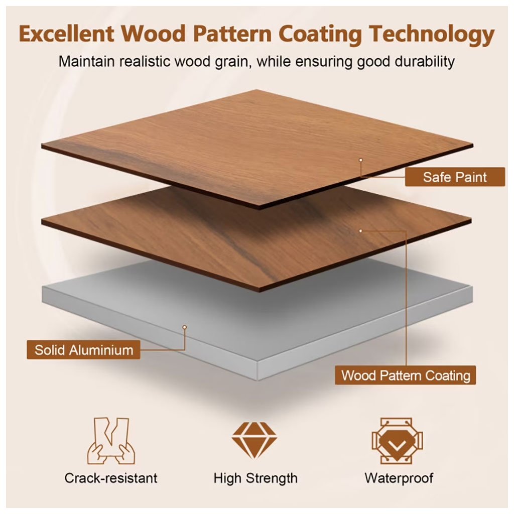 • تجمع بين الجمال والوظيفة: ألواح الألمنيوم مطلية بطبقة مزدوجة مع طباعة خشبية واقعية، مما يمنحك مظهراً فخماً وراقياً مع ميزة المقاومة العالية للصدأ وسهولة التنظيف.