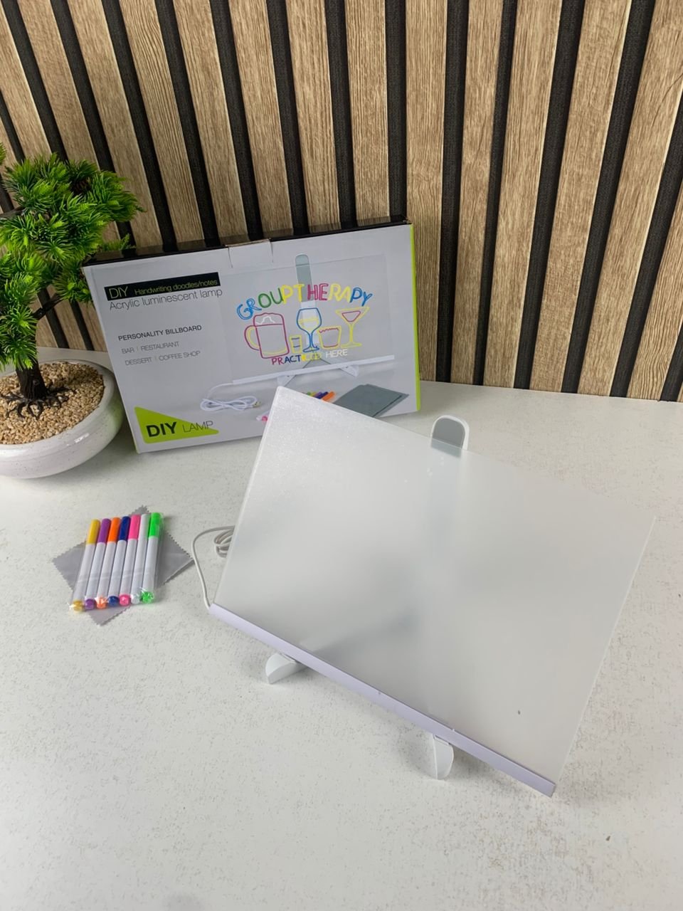 تركيز أكبر ومتعة في الاستخدامعلى عكس الألواح التقليدية، تساعد هذه اللوحة المضيئة الأطفال والكبار على التركيز أكثر على ما هو مكتوب. يمكن استخدامها للرسم، للتخطيط اليومي، أو لترك رسائل لطيفة ومشجعة لأطفالك أو لأفراد العائلة.قابلة لإعادة الاستخدام مع أقلام ملوّنةتأتي اللوحة مع 7 أقلام بألوان مختلفة وقطعتين قماش للمسح. الكتابة عليها سلسة وواضحة، والحبر يجف بسرعة ويمكن مسحه بسهولة. في حال جفّ الحبر لفترة طويلة، يكفي مسحه بقطعة قماش قطنية مبللة بلطف.تصميم مضيء أنيق وعصريمصنوعة من أكريليك شفاف عالي الجودة مع إضاءة LED تمنح تأثيرًا بصريًا جميلًا ومريحًا للعين. تصميمها خفيف وأنيق بدون ترك آثار على السطح، ما يجعلها مناسبة للمكتب، المنزل أو أي مساحة عمل.استخدامات متعددة في مكان واحديمكن استعمالها كـ:لوحة مهام يوميةلوحة ملاحظات أو تذكيرلوحة رسم أو تخطيطلوحة قائمة لمقهىلوحة تحفيزية أو تعليميةدفتر ملاحظات مع تقويمحل عملي يلبي مختلف الاحتياجات اليومية.ملاحظات مهمة للاستخداميرجى إزالة الغلاف الواقي المزدوج عن اللوح الأكريليكي قبل الاستعمال. اللوحة مزودة بحامل قابل للتعديل، مما يسمح بوضعها بالزاوية المناسبة حسب راحتك.لوحة واحدة… تنظيم أفضل، تواصل أجمل، ولمسة عصرية مضيئة في كل مكان.
