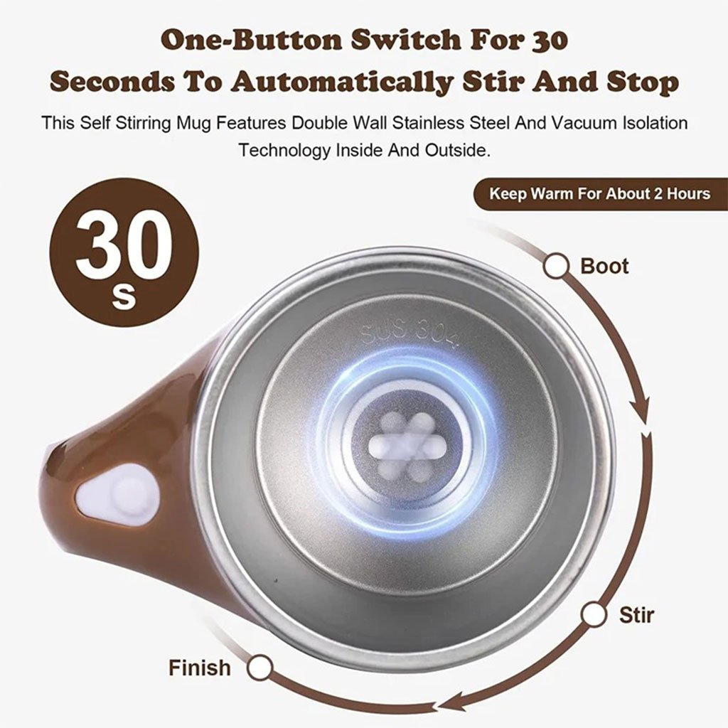 كوب قهوة بخاصية التحريك المغناطيسي الذاتي:بدون ملعقة: ضع القهوة أو مسحوق الشوكولاتة أو أي بودرة واضغط الزر للتحريك.شحن USB: بطارية 400 مللي أمبير قابلة للشحن تدوم لعدة مرات استخدام.سهل الاستخدام والتنظيف: زر تشغيل/إيقاف، شريط تحريك مغناطيسي مقاوم للتآكل وقابل للفصل، تنظيف يدوي سريع.مواد آمنة: طبقة داخلية من الفولاذ المقاوم للصدأ 304 وخارجية من البلاستيك الغذائي، جسم مزدوج الطبقات للحماية من الحرارة. (ملاحظة: غير مناسب للسوائل اللزجة أو الجزيئات الكبيرة، لا يُغسل في غسالة الصحون أو يوضع في الميكروويف.)